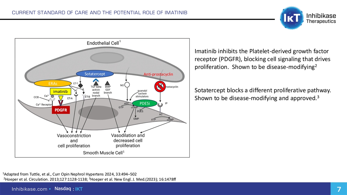 CURRENT STANDARD OF CARE AND THE POTENTIAL ROLE OF IMATINIB 1 Imatinib inhibits the Platelet-derived growth factor receptor (PDGFR), blocking cell signaling that drives 2 proliferation. Shown to be disease-modifying Sotatercept Anti-prostacyclin ERAs Sotatercept blocks a different proliferative pathway. imatinib 3 Shown to be disease-modifying and approved. PDE5i PDGFR 1 1 Adapted from Tuttle, et al., Curr Opin Nephrol Hypertens 2024, 33:494–502 2 3 Hoeper et al. Circulation. 2013;127:1128-1138; Hoeper et al. New Engl. J. Med.(2023); 16:1478ff Inhibikase.com • : IKT 7
